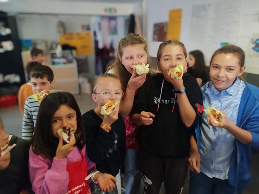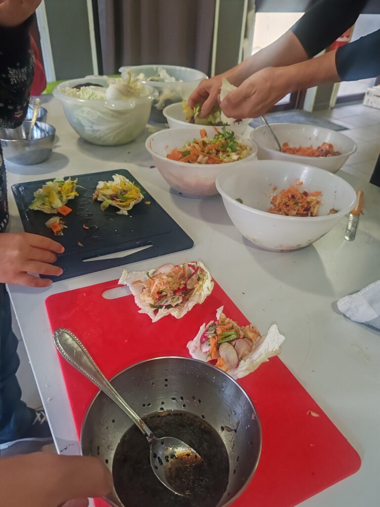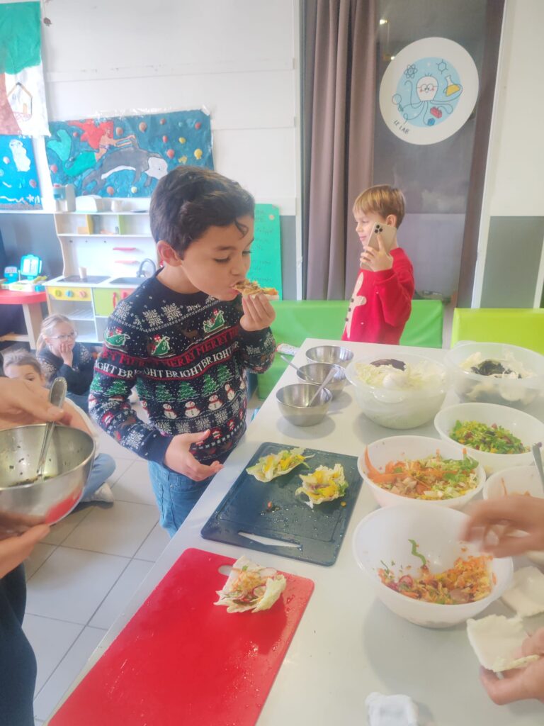Pour conclure ces ateliers, les enfants ont dégusté leurs préparations sous une forme originale et conviviale : des salades servies en tacos, réalisées à partir de feuilles de chou chinois. Malgré quelques réticences au départ, certains enfants qui disaient ne pas aimer certains aliments ont finalement apprécié les déguster une fois intégrés à la salade, prouvant que la découverte et la mise en pratique peuvent changer les regards sur l’alimentation.